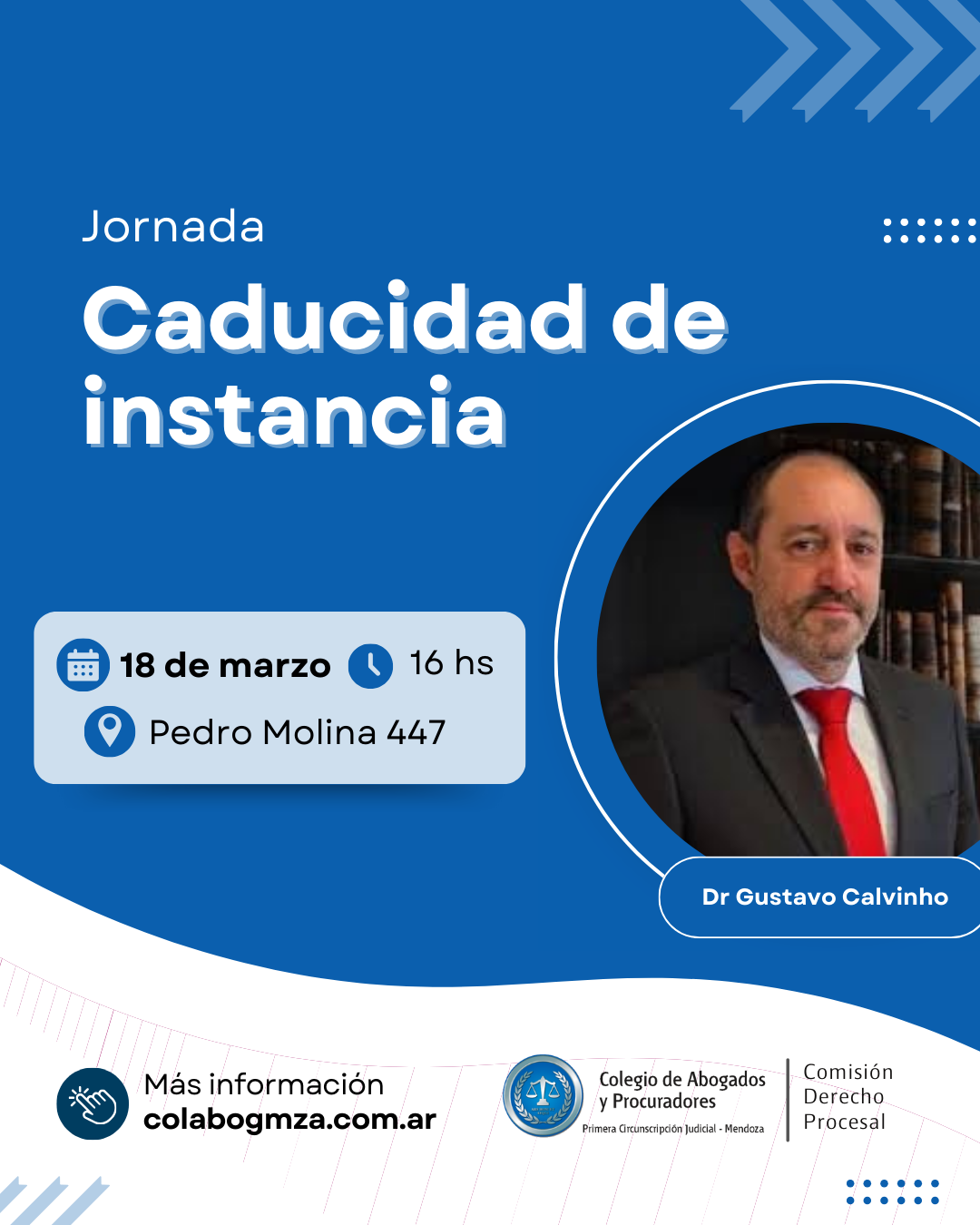 Una jornada en el Colegio de Abogados y Procuradores de la Primera Circunscripción Judicial de Mendoza abordará la «Caducidad de instancia y los aspectos fundamentales del instituto». Tendrá lugar el martes 18 de marzo, a las 16 hs, en la sede ubicada en Pedro Molina 447 de Ciudad.