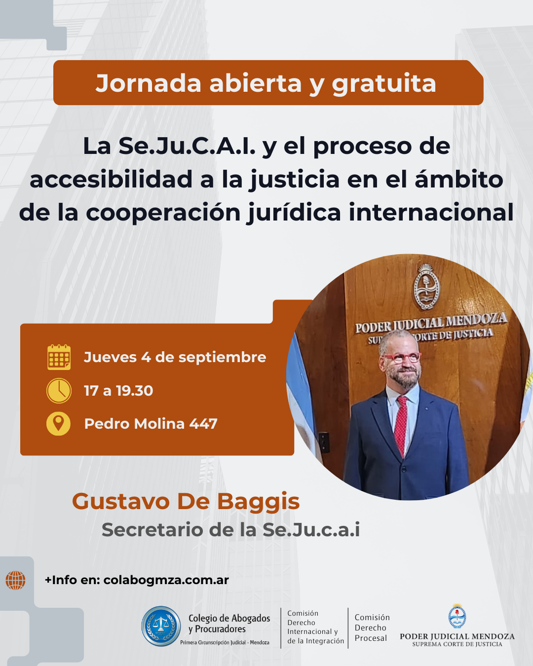 Profesionales podrán participar de la jornada: «La Se.Ju.C.A.I. y el proceso de accesibilidad a la justicia en el ámbito de la cooperación jurídica internacional». Tendrá lugar en la sede del Colegio de Abogados y Procuradores ubicada en Pedro Molina 447, Ciudad de Mendoza, el jueves 4 de septiembre, de 17 a 19.30. Disertará el Dr. Gustavo De Baggis, Secretario de la Se.Ju.c.a.i.