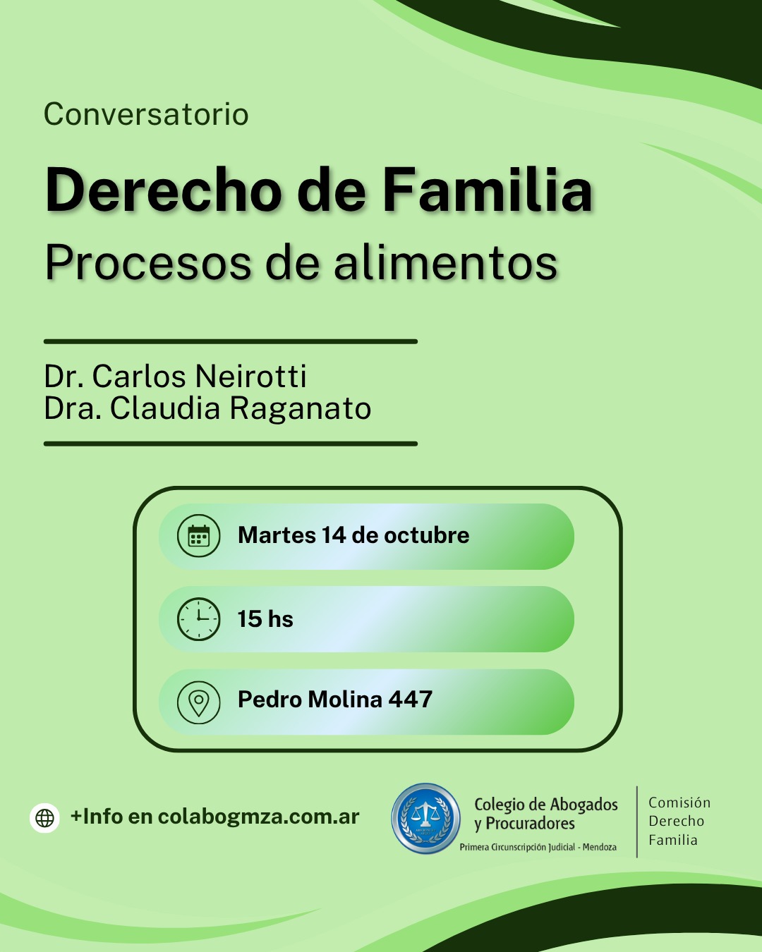 Se realizará el conversatorio «Derecho de familia: procesos de alimentos» en la sede del Colegio ubicada en Pedro Molina 447 de Ciudad. Tendrá lugar el martes 14 de octubre, desde las 15. Disertarán el Dr. Carlos Neirotti y la Dra. Claudia Raganato.