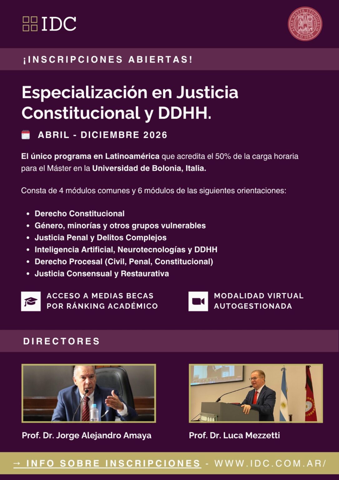 Profesionales del Derecho podrán inscribirse en la Especialización en Justicia Constitucional y Derechos Humanos que otorga título propio apostillable otorgado por la Universidad de Bolonia. Tendrá modalidad virtual y comenzará en abril 2026. Para más información: https://idcar.com.ar/programas/especializacion-en-justicia-constitucional-y-ddhh