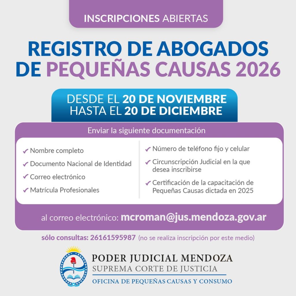 La Oficina de Pequeñas Causas y Consumo abrirá la inscripción en el Registro de Abogados para aquellos letrados que quieran litigar en este tipo de causas. Los profesionales interesados deberán estar matriculados, tener un año de experiencia en el ejercicio de la profesión, haber participado y asistido en una de las capacitaciones que realizó la Oficina de Pequeñas Causas en el transcurso de 2025. Los que cumplan con estos requisitos, deben solicitar la inscripción enviando un correo electrónico a: mcroman@jus.mendoza.gov.ar