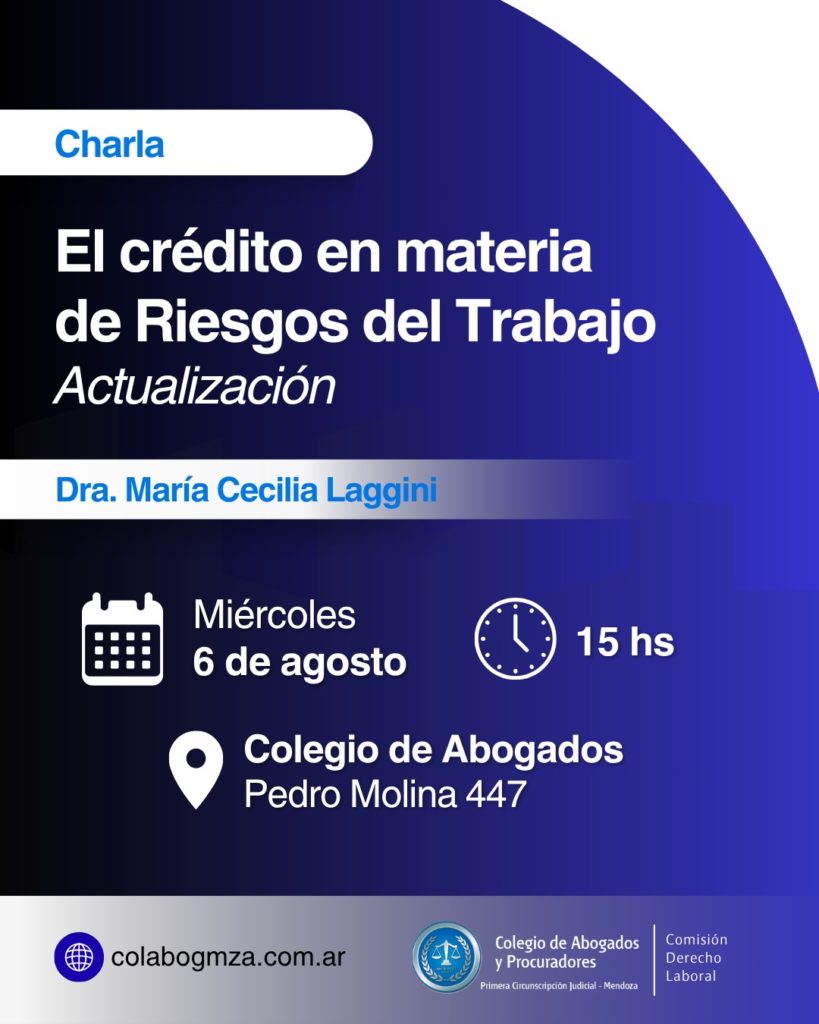 emergentes del sistema de Riesgos del Trabajo podrán inscribirse a la charla «El crédito en materia de Riesgos del Trabajo. Actualización». Tendrá lugar el martes 5 de agosto, a las 15, en la sede del Colegio de Abogados y Procuradores ubicada en Pedro Molina 447, Ciudad de Mendoza.