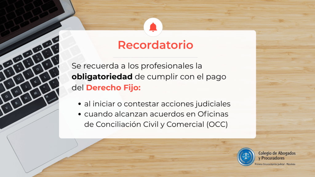 El Colegio de Abogados y Procuradores de la Primera Circunscripción Judicial de Mendoza recuerda a los profesionales la importancia de cumplir con el pago del Derecho Fijo.