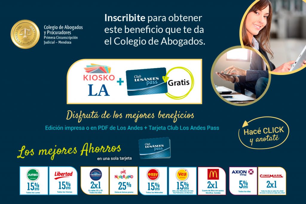 El acuerdo con El diario Los Andes les ofrece a los abogados y procuradores del Colegio de Abogados y Procuradores de la primera circunscripción judicial el Kiosco Digital -la edición digital diaria del Diario Los Andes en PDF- y la tarjeta club de Los Andes Pass sin cargo.