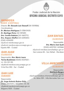 La Oficina Judicial del Distrito Cuyo del Poder Judicial de la Nación pone en conocimiento la Infografía actualizada con los datos de contacto de la
