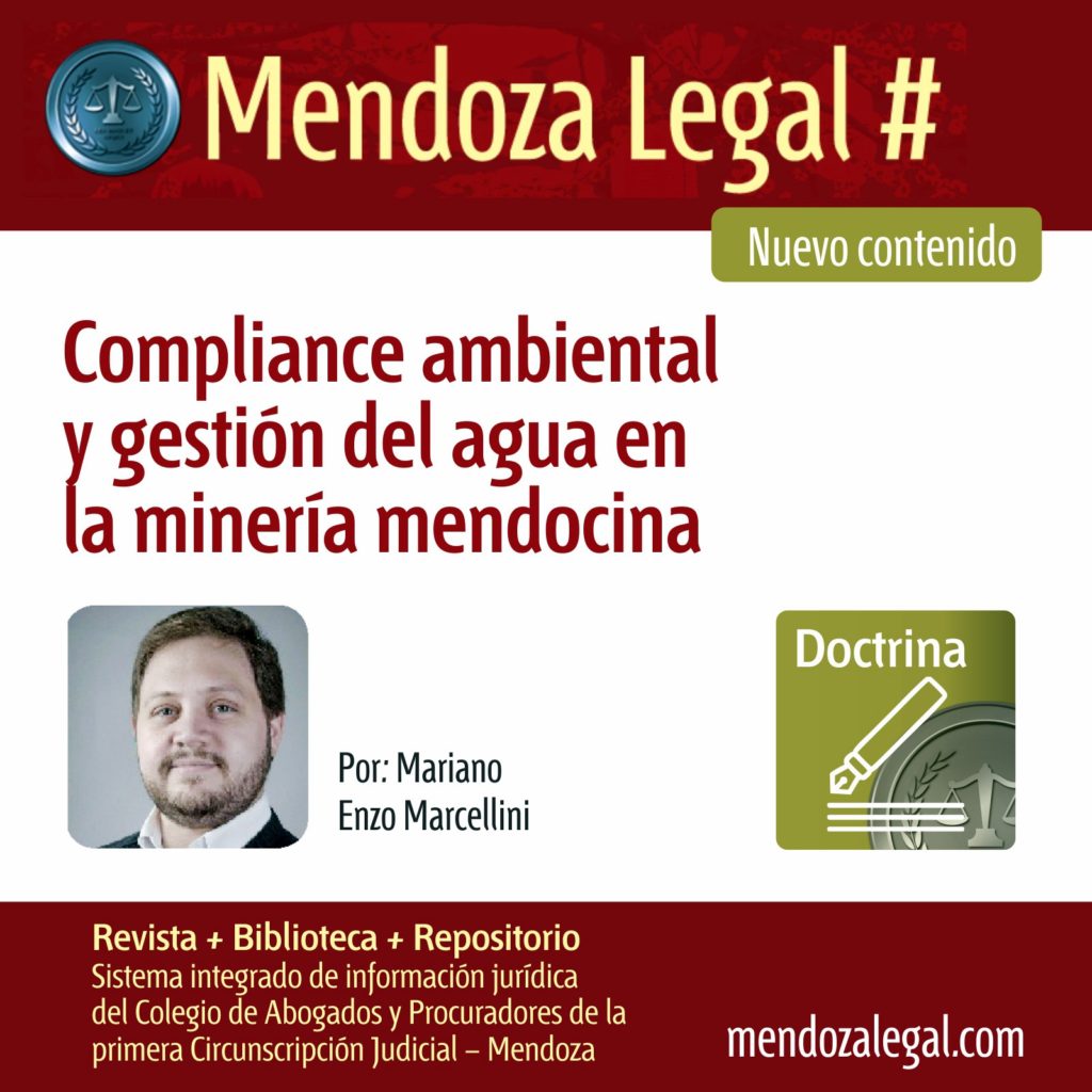 La minería en Mendoza se desarrolla en un contexto crítico marcado por la escasez hídrica, una normativa fragmentada y una alta sensibilidad social respecto del uso del agua. Este trabajo analiza el rol del compliance ambiental como herramienta estratégica para integrar el marco regulatorio aplicable —Ley de Aguas de 1884, Ley 7.722, Ley de Procedimiento Minero y los estándares de evaluación de impacto ambiental— con la gestión responsable del recurso hídrico.