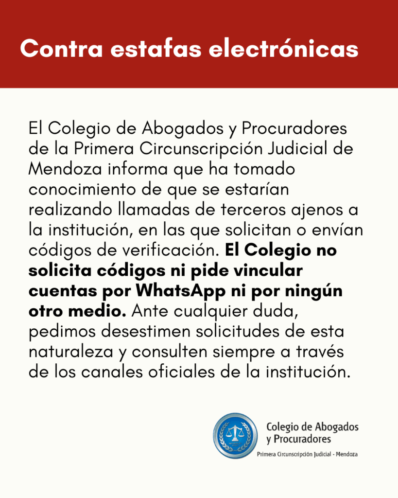 El Colegio de Abogados y Procuradores de la Primera Circunscripción Judicial de Mendoza informa que ha tomado conocimiento de que se estarían realizando llamadas de terceros ajenos a la institución, en las que solicitan o envían códigos de verificación. El Colegio no solicita códigos ni pide vincular cuentas por WhatsApp ni por ningún otro medio. Ante cualquier duda, pedimos desestimen solicitudes de esta naturaleza y consulten siempre a través de los canales oficiales de la institución.