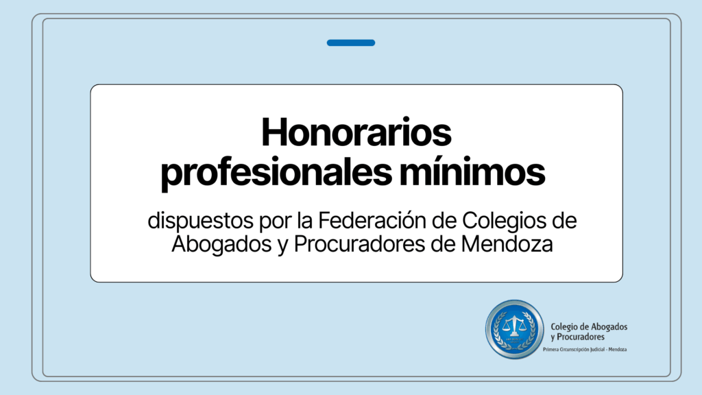 La Resolución 01/2019, de la Federación de Colegios de Abogados y Procuradores de Mendoza (que se puede consultar debajo de este texto) establece los honorarios mínimos por labores y gestiones extrajudiciales de los abogados y procuradores. Por su parte autoridades del Colegio de la Primera Circunscripción Judicial de Mendoza recuerdan que cobrar honorarios por debajo de esos mínimos es una falta ética, conforme lo señala el Artículo 45, Inciso 2, del Código de Ética.