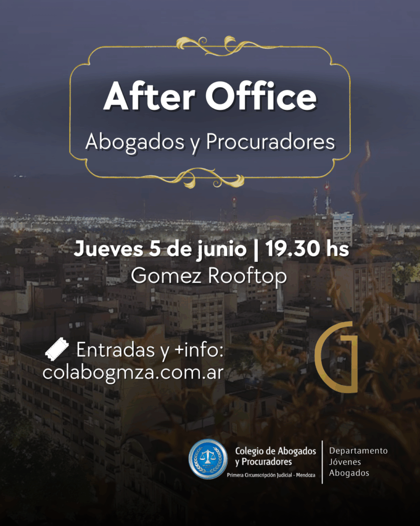 Abogados y procuradores podrán disfrutar de un encuentro distendido y social en un After Office que se realizará el jueves 5 de junio, desde las 19.30, en Gomez Rooftop, situado en Garibaldi 7, 10 piso, de la Ciudad de Mendoza. Entradas agotadas.