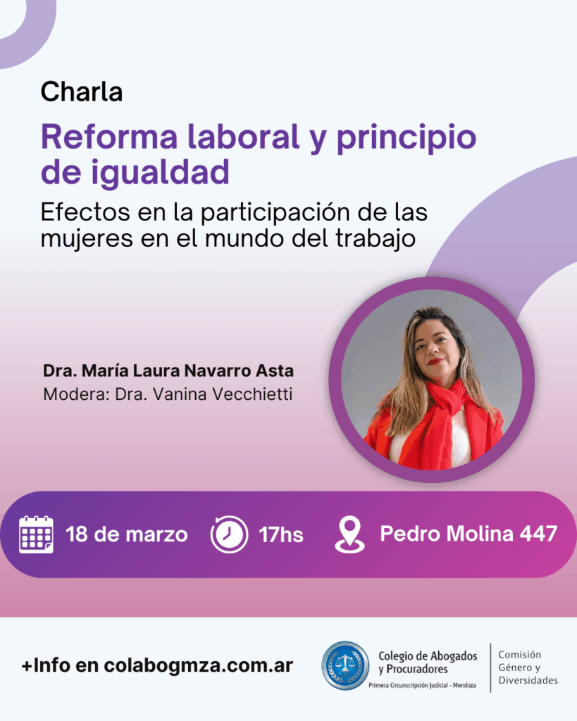 «Reforma laboral y principio de igualdad: efectos en la participación de las mujeres en el mundo del trabajo» es el tema de una conferencia sin costo que tendrá lugar en la sede del Colegio de Abogados y Procuradores de la Primera Circunscripción Judicial, ubicada en Pedro Molina 447, Ciudad de Mendoza.