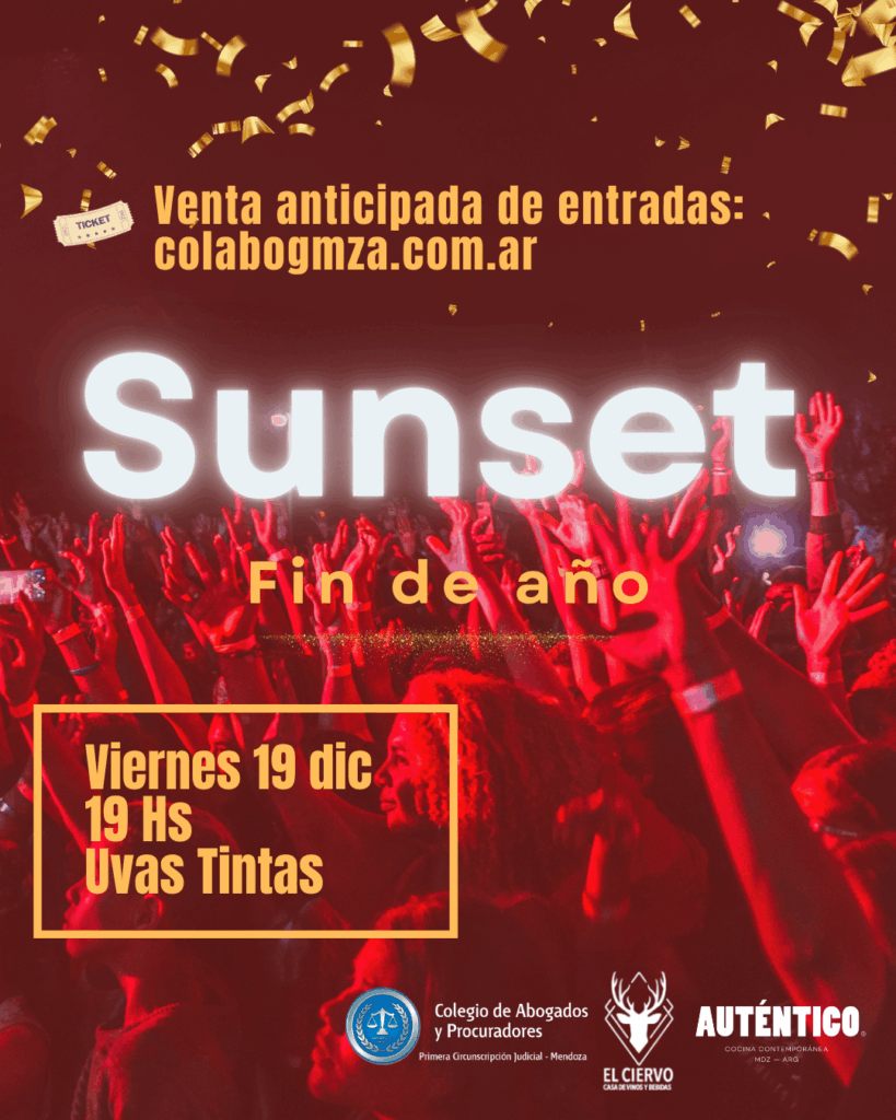 El Colegio de Abogados y Procuradores de la Primera Circunscripción Judicial despedirá el 2025 con el Sunset para abogados y procuradores que incluirá música y servicio de barra. Además, habrá food trucks con diferentes opciones de comida. El evento contará con la participación del DJ Belisario Zaina. La reunión está prevista para el viernes 19 de diciembre desde las 19 en el predio Uvas Tintas, ubicado en Rusell, Maipú. Ubicación: https://goo.gl/maps/ZsPM7N1UPfzz7YPv8