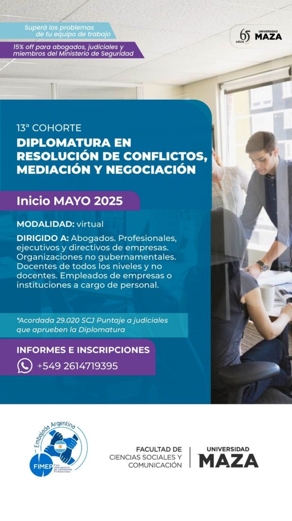 La Diplomatura en Resolución de Conflictos, Mediación y Negociación es una propuesta que ofrece la Universidad Maza, destinada a profesionales interesados en la práctica de la mediación y resolución de conflictos, ejecutivos, directivos de empresas, docentes de todos los niveles y organizaciones no gubernamentales. Tendrá modalidad virtual y se cursará a partir del 29 de mayo.