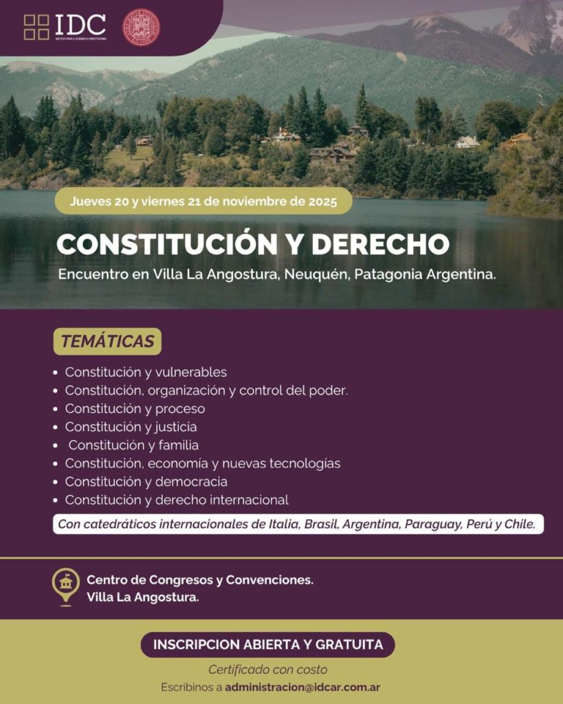 La ciudad de Villa La Angostura será sede de un evento jurídico el 20 y 21 de noviembre. El Centro de Congresos y Convenciones recibirá a un grupo de destacados expertos en el Encuentro «Constitución y Derecho», que reunirá a egresados de la Universidad de Bolonia de Latinoamérica y a constitucionalistas de Argentina, Italia, Brasil y Paraguay.