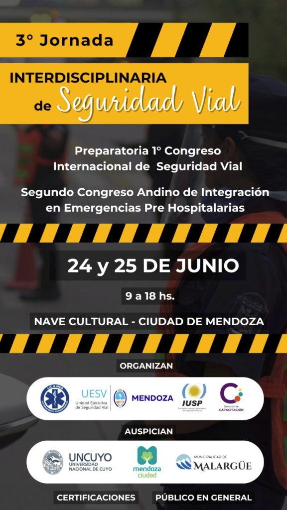 La 3º Jornada Interdisciplinaria de Seguridad Vial tendrá lugar el 24 y 25 de junio, de 9 a 19, en la Nave Cultural ubicada en Juan Agustín Maza 250 de la ciudad de Mendoza. Será un encuentro preparatorio del 1º Congreso Internacional de Seguridad Vial y del 2º Congreso Andino de Integración en Emergencias Prehospitalarias.