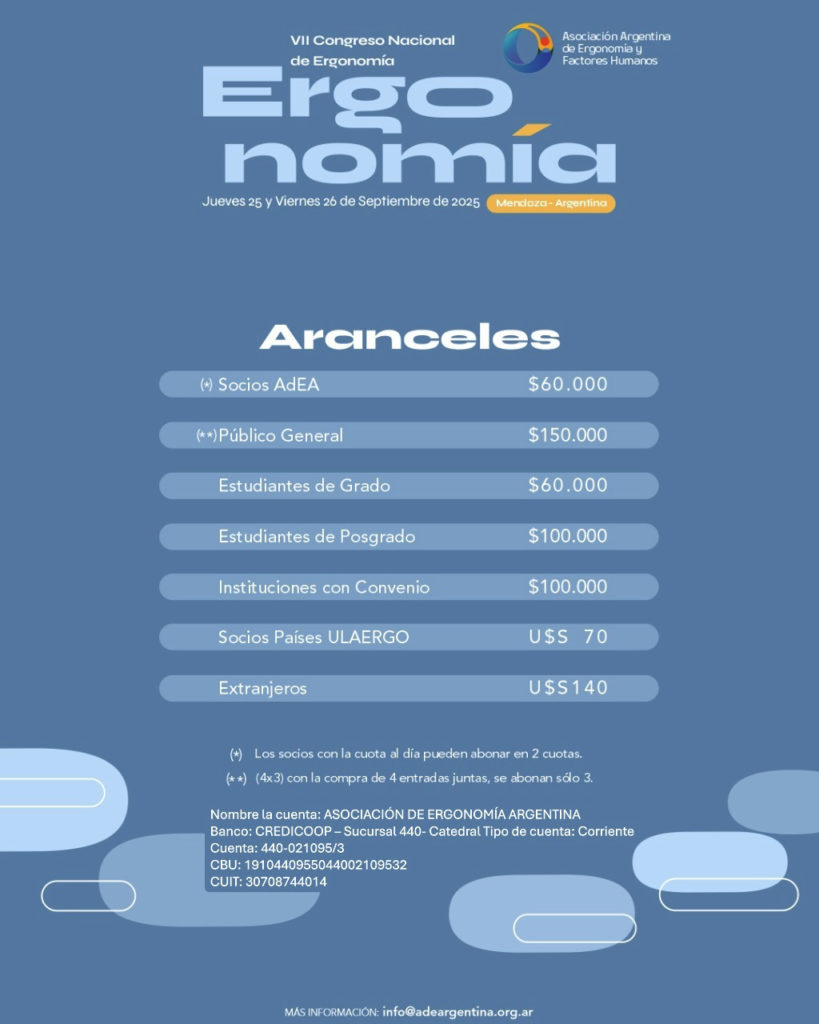 Para más información se puede ingresar al link: https://adeargentina.org.ar/vii-congreso-nacional-de-ergonomia/, comunicarse por mail a Mail: roxanadelrosso@gm.fad.uncu.edu.ar o por WhatsApp al 2615683819.