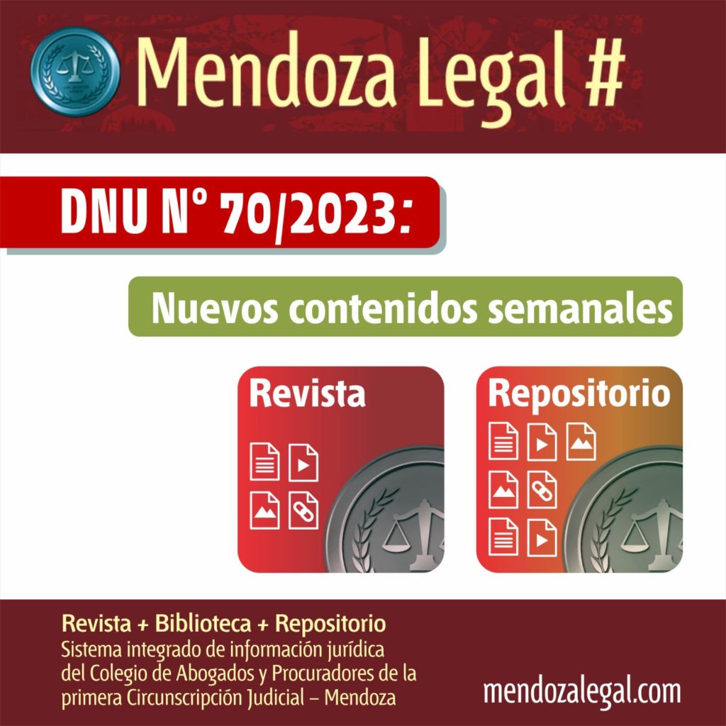 Mendoza Legal, el sistema integrado de información jurídica del Colegio de Abogados y Procuradores de la Primera Circunscripción Judicial de Mendoza, pone a disposición de la comunidad jurídica y del público en general una serie de contenidos relacionados con el DNU 70/2023.