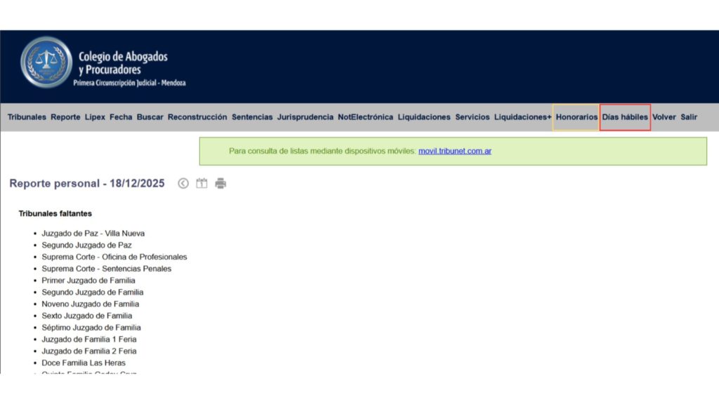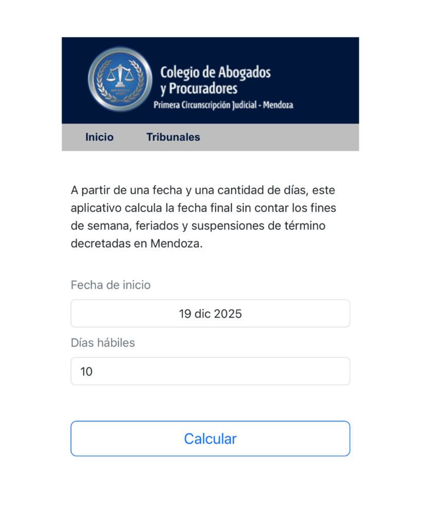 • Calculadora de Días Hábiles: Esta herramienta permite establecer la fecha de finalización de un plazo judicial. El aplicativo descuenta automáticamente fines de semana, feriados y las suspensiones de términos decretadas en la provincia de Mendoza.