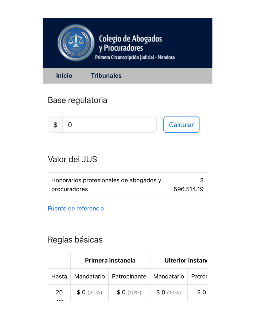 - Honorarios: Ingresando en la pestaña de «Honorarios», el profesional solo debe colocar la base regulatoria. El sistema arrojará los valores correspondientes según las reglas básicas y el valor del JUS actualizado.