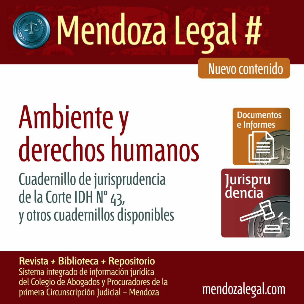En Mendoza Legal, el sistema integrado de información jurídica del Colegio de Abogados y Procuradores de la Primera Circunscripción Judicial de Mendoza, puedes encontrar todos los cuadernillos de jurisprudencia en Mendoza Legal, haciendo clic aquí: https://mendozalegal.com/2026/01/02/ambiente-y-derechos-humanos-jurisprudencia-de-la-corte-idh/