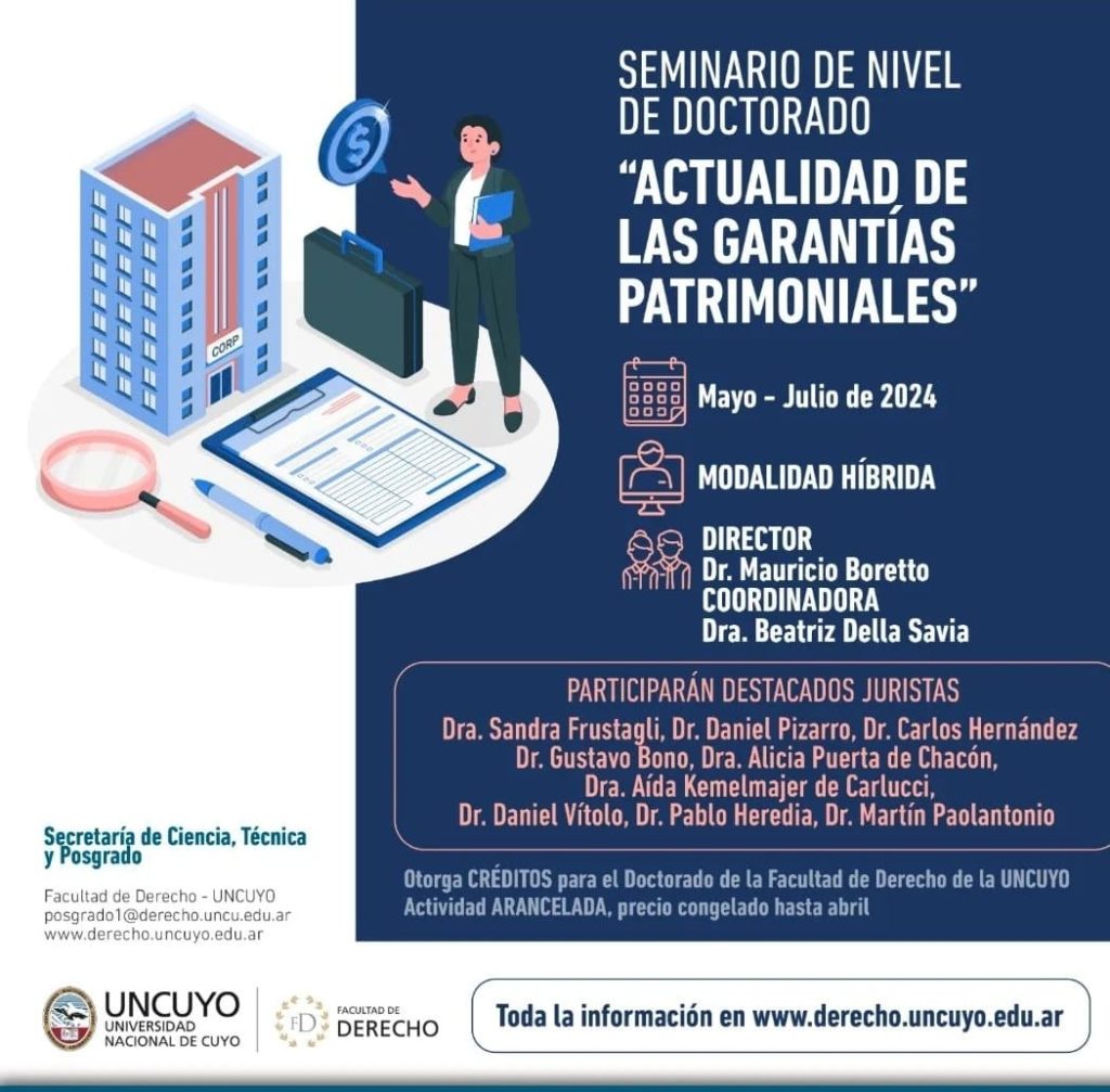 En el del Doctorado en Derecho de la UNCuyo dictarán un seminario titulado “Actualidad de las garantías patrimoniales en el derecho argentino y comparado”. Profundizará en el estudio de diferentes temas del derecho privado, que tienen como eje común las garantías patrimoniales abordadas tanto desde el derecho argentino como internacional. Comienza el 31 de mayo y se extenderá a lo largo de 10 jornadas, bajo modalidad presencial e híbrida para quienes residan a más de 170 km.