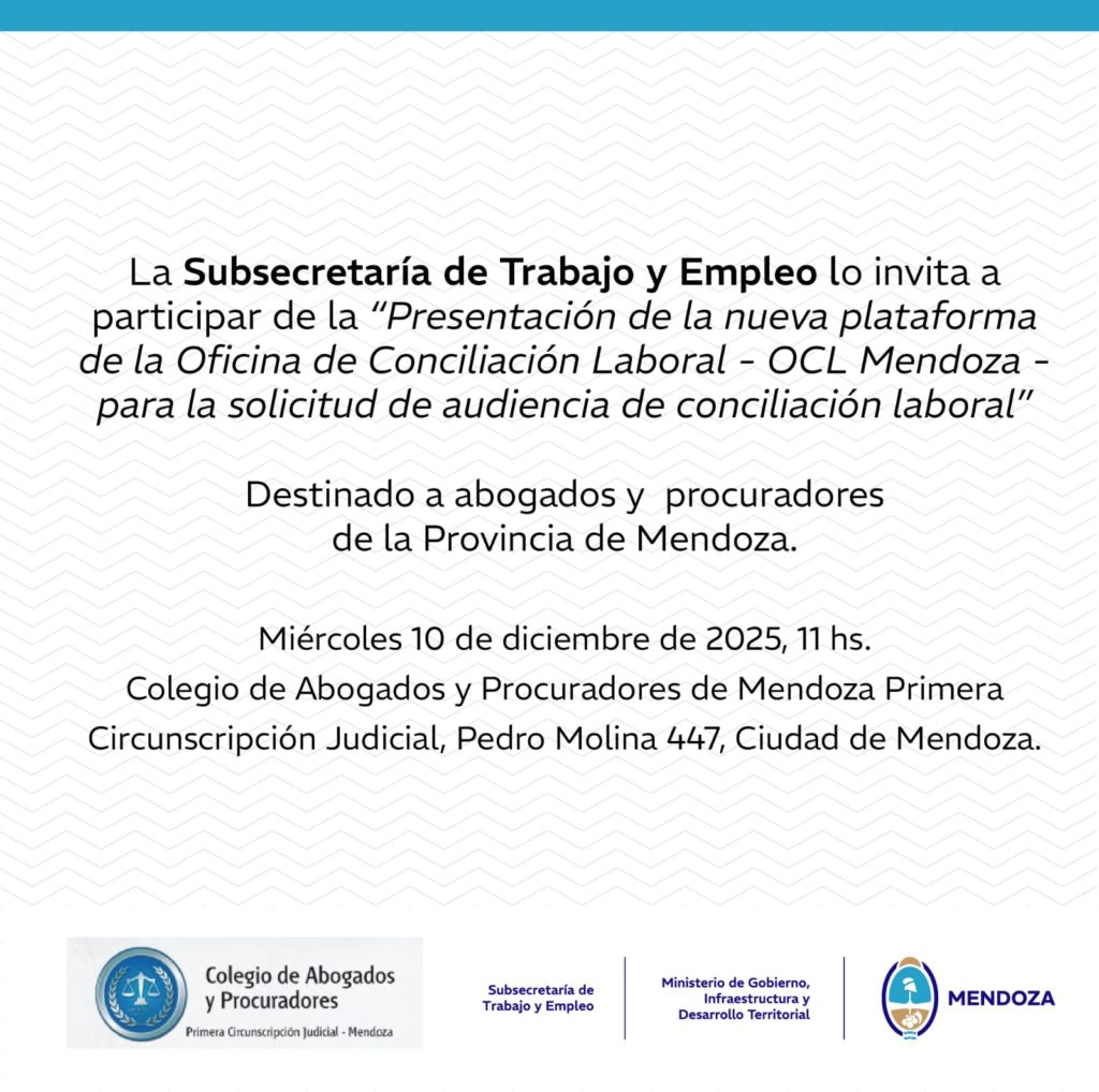 La Subsecretaria de Trabajo y Empleo presentará la nueva plataforma de la Oficina de Conciliacién Laboral – OCL Mendoza para la solicitud de audiencia de conciliación laboral. Tendrá lugar el miércoles 10 de diciembre, a las 11, en la sede del Colegio de Abogados y Procuradores de la Primera Circunscripción Judicial ubicada en Pedro Molina 447 de Ciudad.