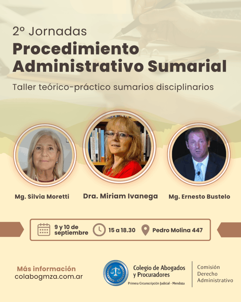 El Colegio de Abogados y Procuradores de la Primera Circunscripción Judicial será sede de las «2º Jornadas de Procedimiento Administrativo Sumarial: Taller teórico-práctico sumarios disciplinarios». Serán el martes 9 y miércoles 10 de septiembre, de 15 a 18.30, en Pedro Molina 447, Ciudad de Mendoza.