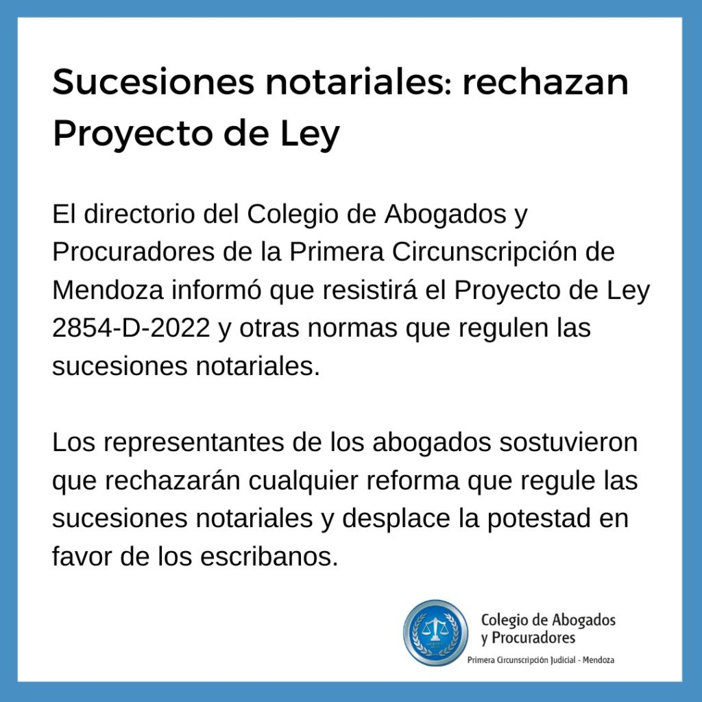 El directorio del Colegio de Abogados y Procuradores de la Primera Circunscripción de Mendoza informó que resistirá el Proyecto de Ley 2854-D-2022 y otras normas que regulen las sucesiones notariales.