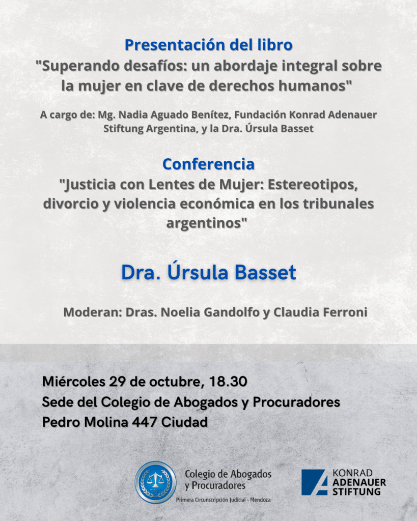 Será el miércoles 29 de octubre, a las 18.30, en el salón de actos del Colegio de Abogados y Procuradores, ubicado en Pedro Molina 447 de Ciudad. En el marco de la presentación, la Dra. Basset dictará una conferencia sobre estereotipos, divorcio y violencia económica.