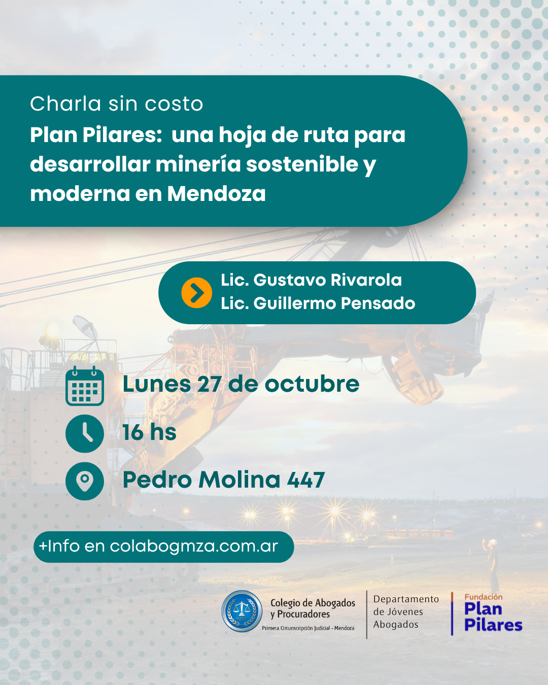 «Plan Pilares: una hoja de ruta para desarrollar minería sostenible y moderna en Mendoza» es el nombre de una charla sin costo que se desarrollará en el Colegio de Abogados y Procuradores de la Primera Circunscripción Judicial de Mendoza, ubicado en Pedro Molina 447 de Ciudad. Será el lunes 27 de octubre, a las 16, y estará a cargo de Gustavo Rivarola y Guillermo Pensado, gerente y vicepresidente de la Fundacion Plan Pilares.