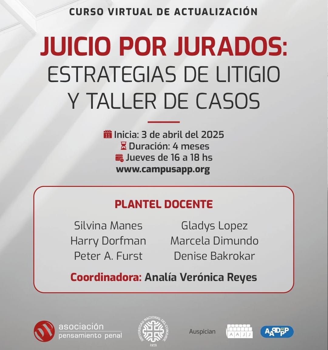 Certificado: Curso certificado por la Asociación de Pensamiento Penal y las Fac. de Derecho de la UNComa. El certificado será remitido digitalmente a las personas que aprueben el curso.