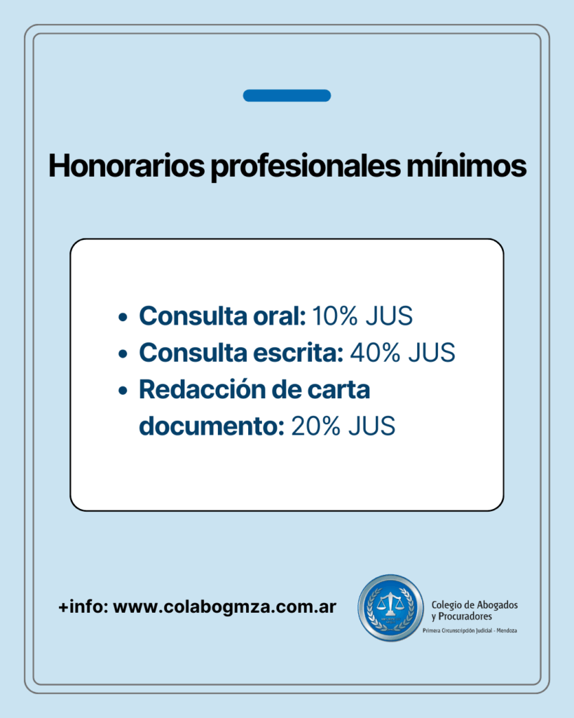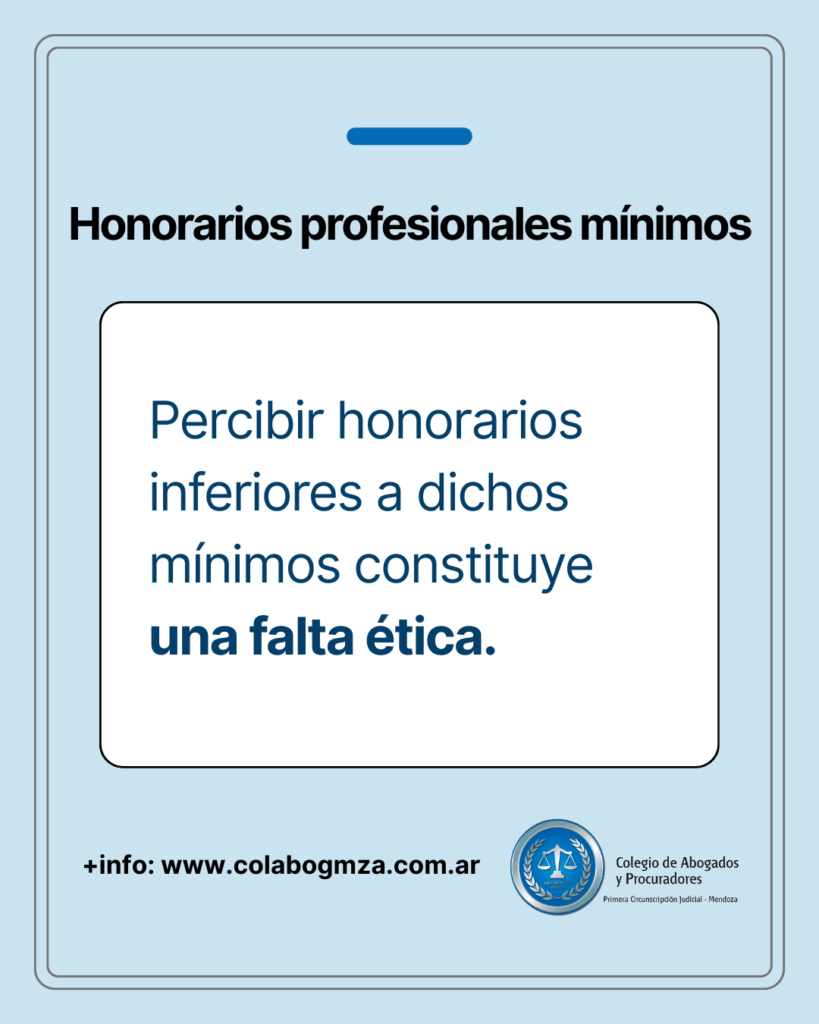 La Resolución 01/2019, de la Federación de Colegios de Abogados y Procuradores de Mendoza (que se puede consultar debajo de este texto) establece los honorarios mínimos por labores y gestiones extrajudiciales de los abogados y procuradores. Por su parte autoridades del Colegio de la Primera Circunscripción Judicial de Mendoza recuerdan que cobrar honorarios por debajo de esos mínimos es una falta ética, conforme lo señala el Artículo 45, Inciso 2, del Código de Ética.
