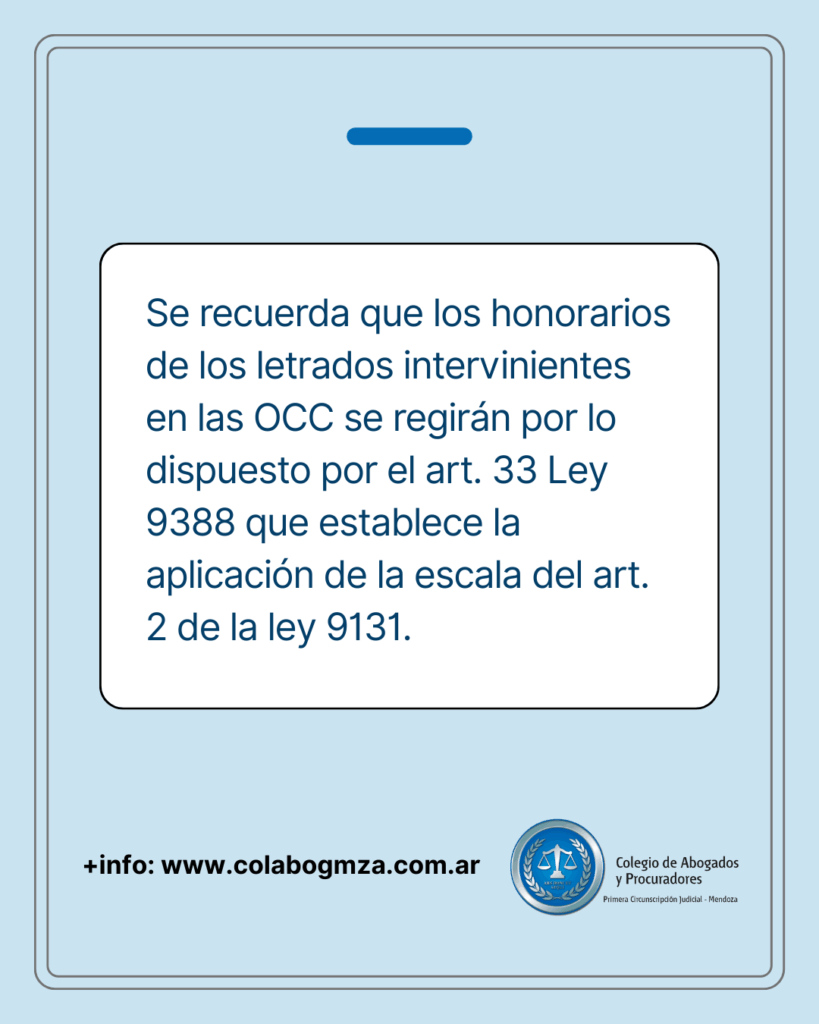 Asimismo, se recuerda que los honorarios de los letrados intervinientes en las OCC se regirán por lo dispuesto por el art. 33 Ley 9388 que establece la aplicación de la escala del art. 2 de la ley 9131.
