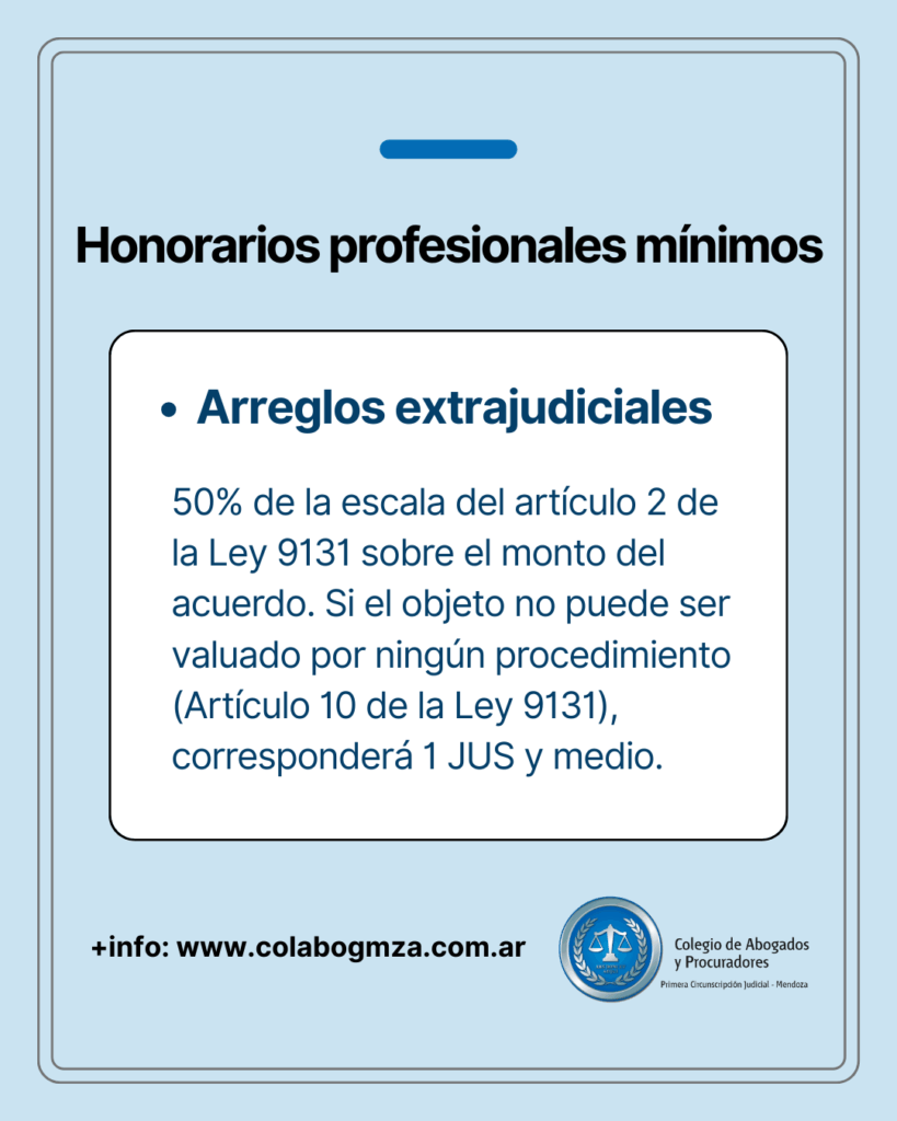 d) Arreglos extrajudiciales, 50% de la escala del artículo 2 de la Ley 9131 sobre el monto del acuerdo. Si el objeto no puede ser valuado por ningún procedimiento (Artículo 10 de la Ley 9131), corresponderá 1 JUS y medio.