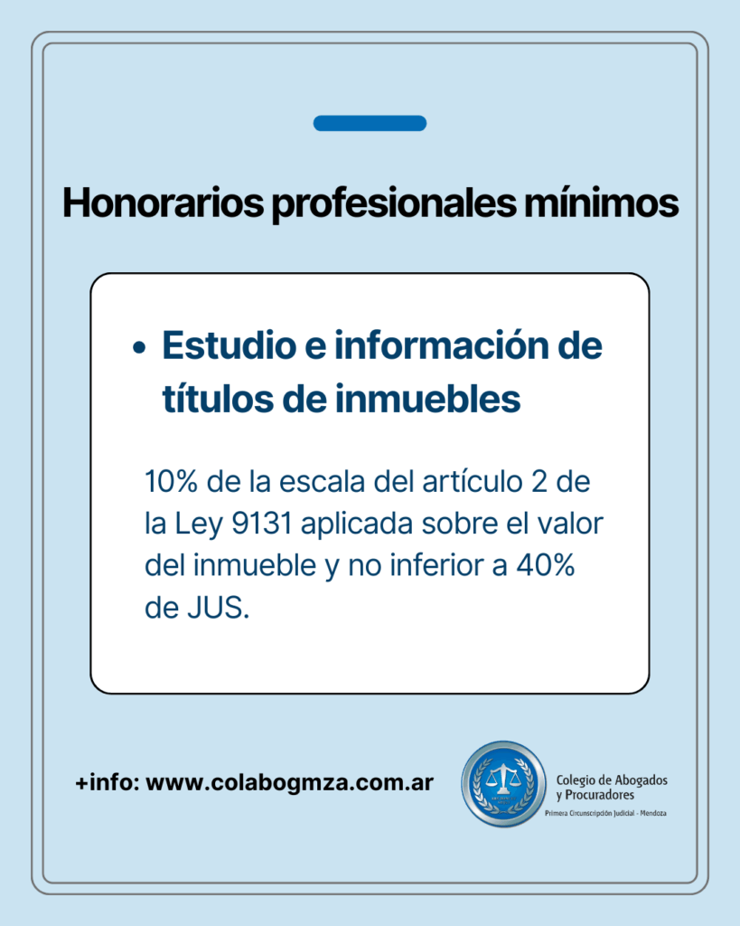 e) Estudio e información de títulos de inmuebles, 10% de la escala del artículo 2 de la Ley 9131 aplicada sobre el valor del inmueble y no inferior a 40% de JUS.
