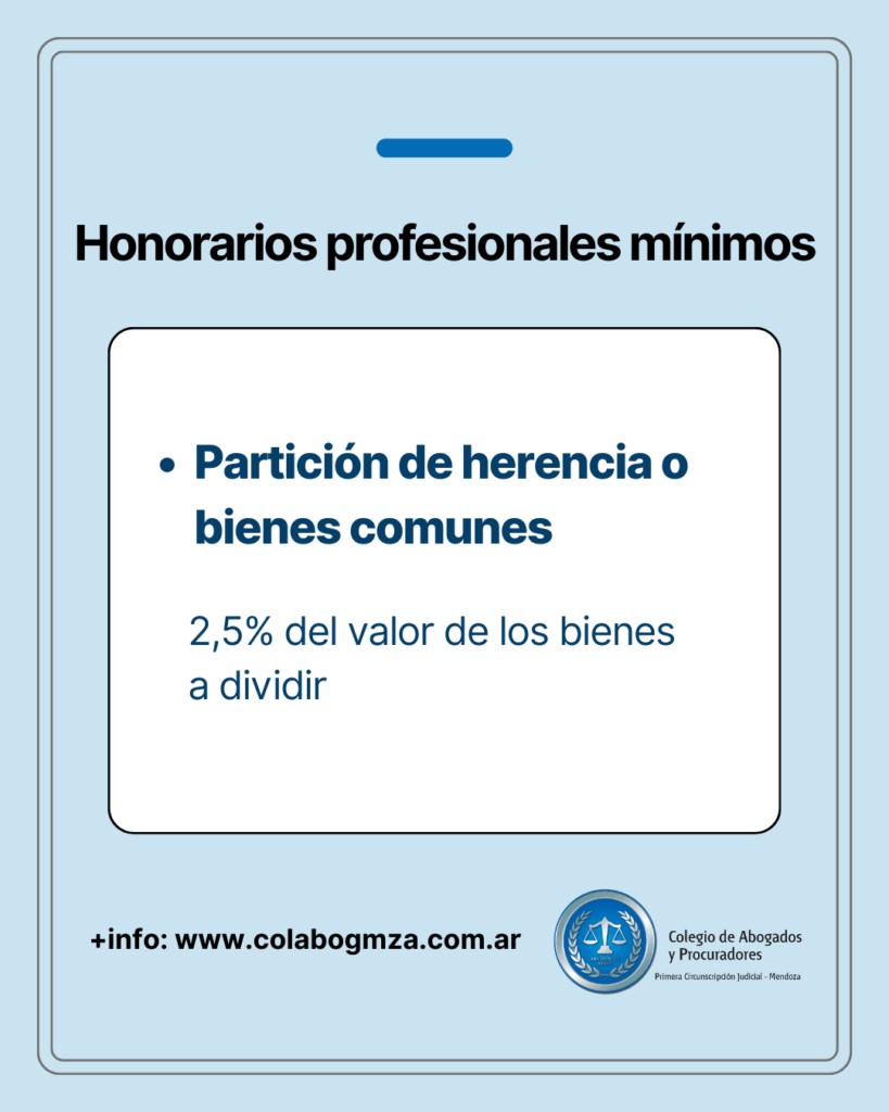 g) Partición de herencia o bienes comunes por escritura pública o instrumento privado bajo la dirección del abogado, el 2,5% del valor de los bienes a dividir.