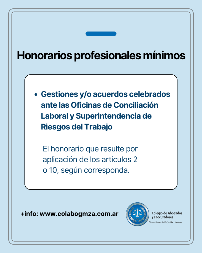h) Por las gestiones y/o acuerdos celebrados ante las Oficinas de Conciliación Laboral y Superintendencia de Riesgos del Trabajo, el honorario que resulte por aplicación de los artículos 2 o 10, según corresponda.
