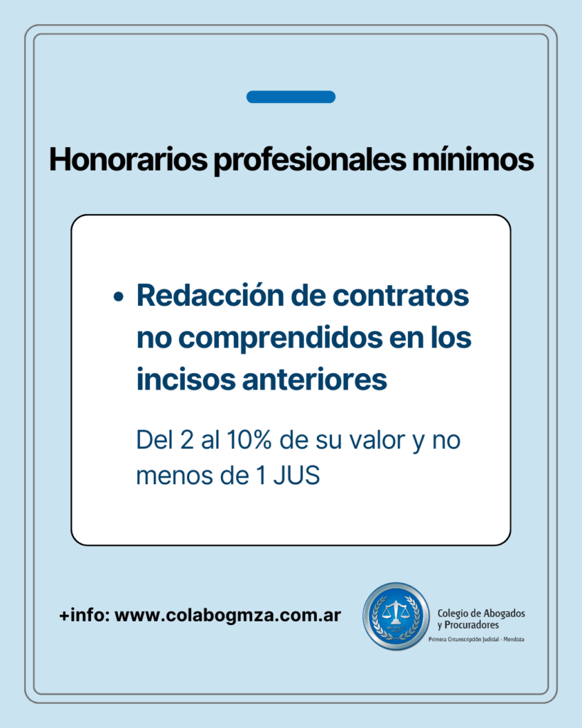 i) Por redacción de contratos no comprendidos en los incisos anteriores, del 2 al 10% de su valor y no menos de 1 JUS.