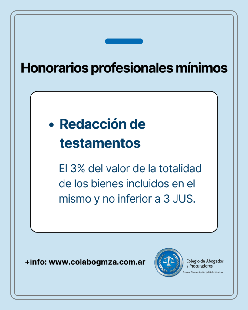 j) Por la redacción de testamentos, el 3% del valor de la totalidad de los bienes incluidos en el mismo y no inferior a 3 JUS.