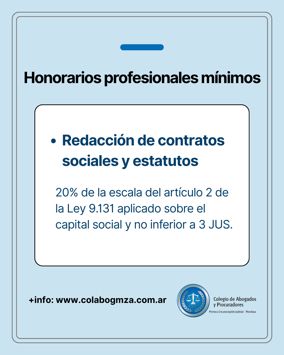 f) Redacción de contratos o estatutos de sociedades comerciales, asociaciones fundaciones y constitución de personas jurídicas en general, el 20% de la escala del artículo 2 de la Ley 9.131 aplicado sobre el capital social y no inferior a 3 JUS.