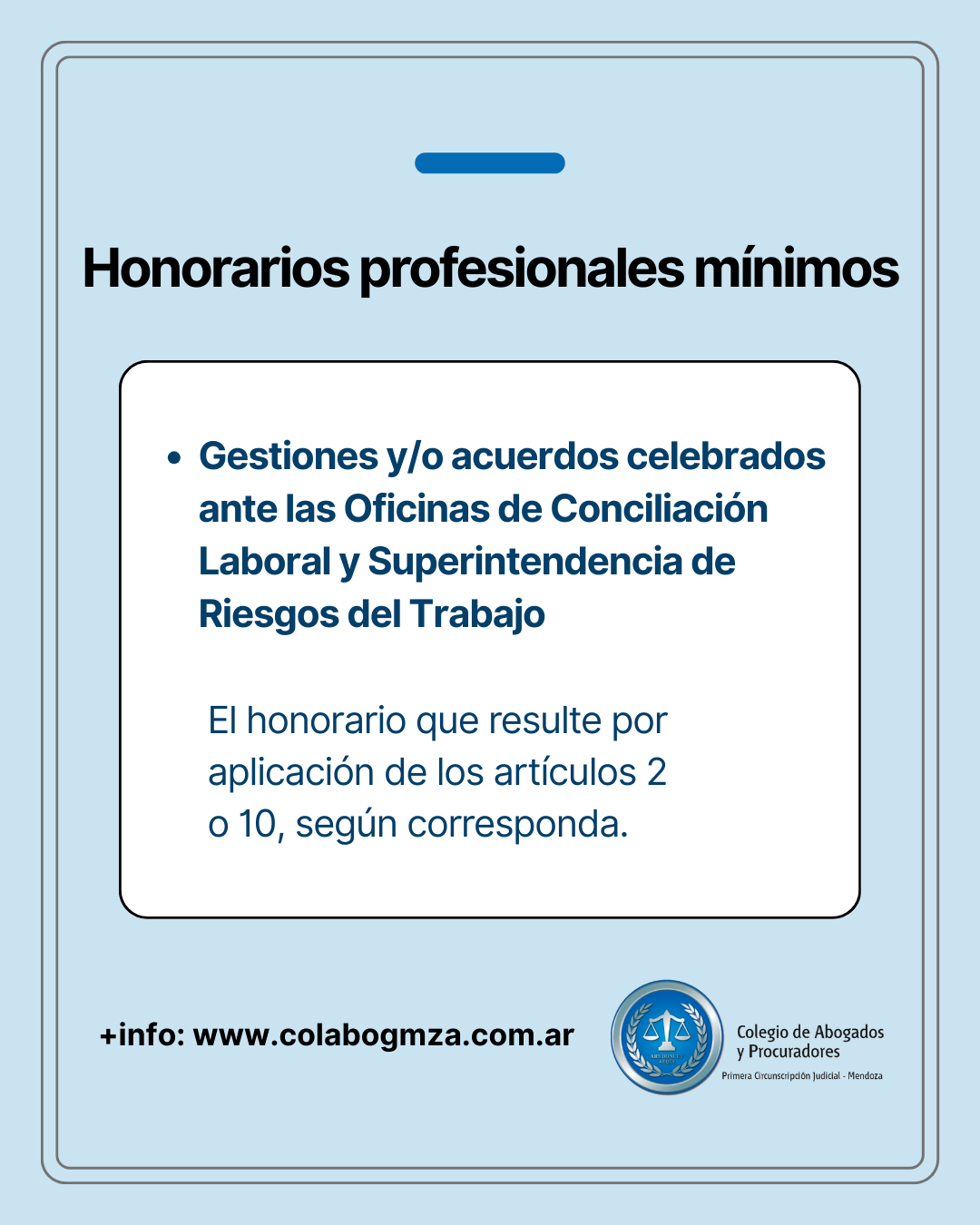 La Resolución 01/2019, de la Federación de Colegios de Abogados y Procuradores de Mendoza (que se puede consultar debajo de este texto) establece los honorarios mínimos por labores y gestiones extrajudiciales de los abogados y procuradores. Por su parte autoridades del Colegio de la Primera Circunscripción Judicial de Mendoza recuerdan que cobrar honorarios por debajo de esos mínimos es una falta ética, conforme lo señala el Artículo 45, Inciso 2, del Código de Ética.