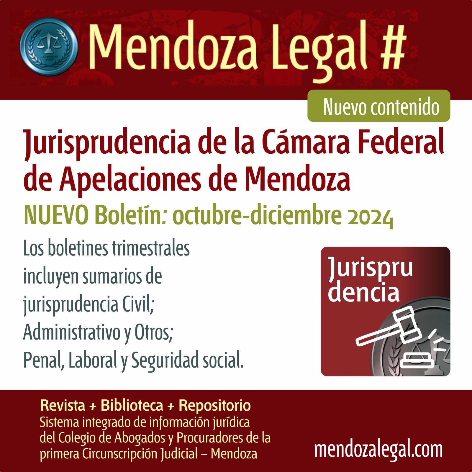 Mendoza Legal es el sistema integrado de información jurídica del Colegio de Abogados y Procuradores de la Primera Circunscripción Judicial de Mendoza. Una de sus últimas publicaciones que ofrece el Boletín de Jurisprudencia Nº 27 (abril a junio de 2025) incluye un índice de fallos sobre la jurisprudencia Penal, jurisprudencia en aplicación del Código Procesal Penal Federal, jurisprudencia No Penal (Civil, Administrativo, Fiscal, Laboral, etc.), Jurisprudencia sobre Seguridad Social y Derecho a la Salud.
